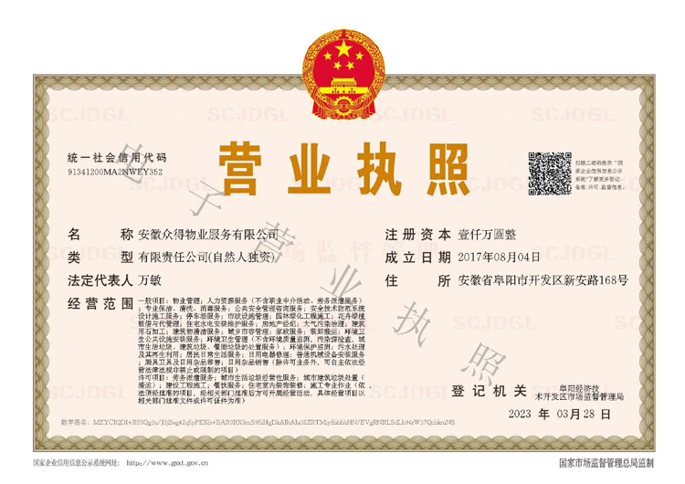 - 安徽眾得物業(yè)服務(wù)有限公司成立于2017年08月,注冊(cè)資金一千萬(wàn)元。自公司成立以來(lái),始終遵循“業(yè)主至上、服務(wù)第一”的企業(yè)宗旨,發(fā)揚(yáng)“團(tuán)結(jié)、務(wù)實(shí)、開(kāi)拓、創(chuàng)新”的企業(yè)精神,樹(shù)立了“以人為本、人性化管理,以客為尊、讓客戶滿意”的經(jīng)營(yíng)理念,創(chuàng)立了具有眾得特色的物業(yè)服務(wù)模式。 基礎(chǔ)服務(wù) 保潔服務(wù):小區(qū)保潔、單位保潔、商場(chǎng)保潔、醫(yī)院保潔...... 保安服務(wù):小區(qū)保安、單位保安、商場(chǎng)保安、醫(yī)院保安...... ...
